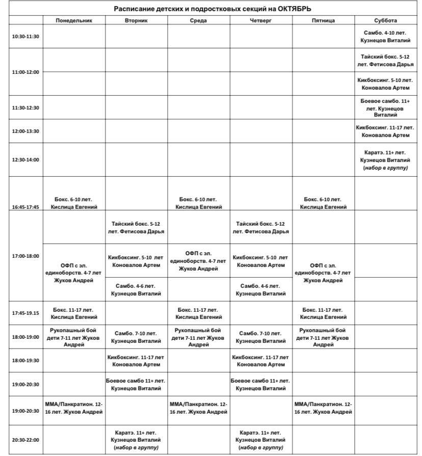 | подростки 11-17 лет Боевое самбо | 19:00-20:00 | 11:30-12:30 |